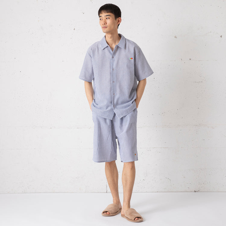 軽くてベタつかないシアサッカー地で、夏場も快適に過ごせます。柄は爽やかなキャンディストライプをイエロー、ネイビー、レッドの3色でご用意。左胸と左裾に入るフルーツロゴがワンポイントとなっています。