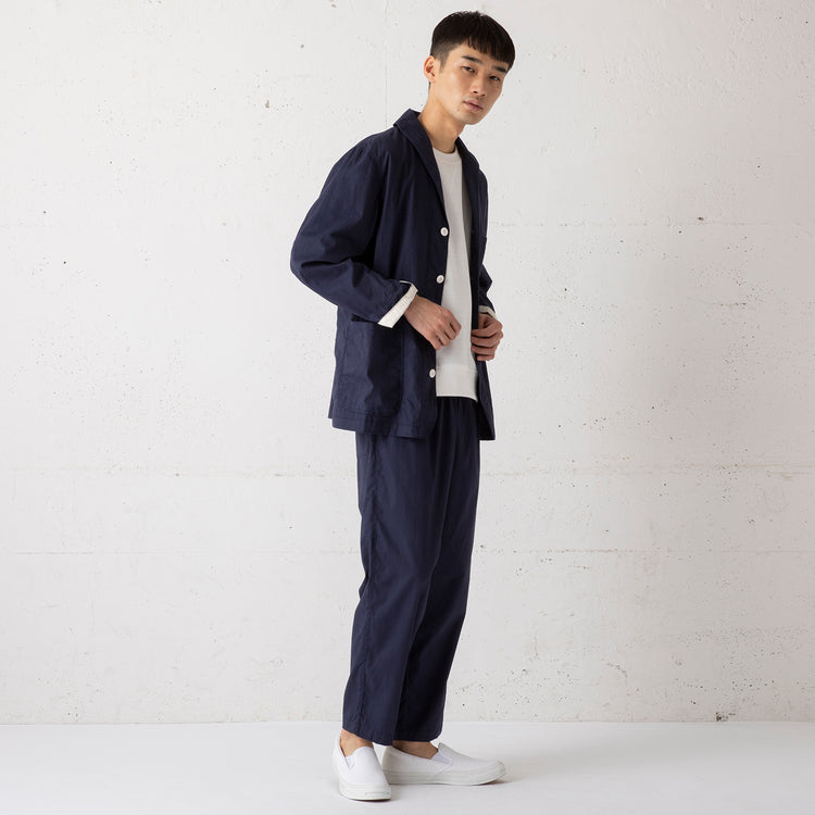 袖口を折り返し着るとデザイン性が増すショールカラーのジャケットと、ウエストゴムのタック入りパンツ。実はこれ、冬にビギンマーケットでも紹介し大人気だったフランネル素材の生地変えバーション。今回は軽くて着心地のいいコットンツイル素材を使用しています。