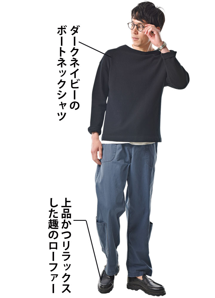 適度なボリューム感のあるローファーが相性よし。トラディショナル ウェザーウェアのカットソー1万2000円(トラディショナル ウェザーウェア 青山メンズ店) アイヴァン7285の眼鏡4万円(アイヴァン 7285 トウキョウ) パラブーツのシューズ6万5000円(パラブーツ青山店)