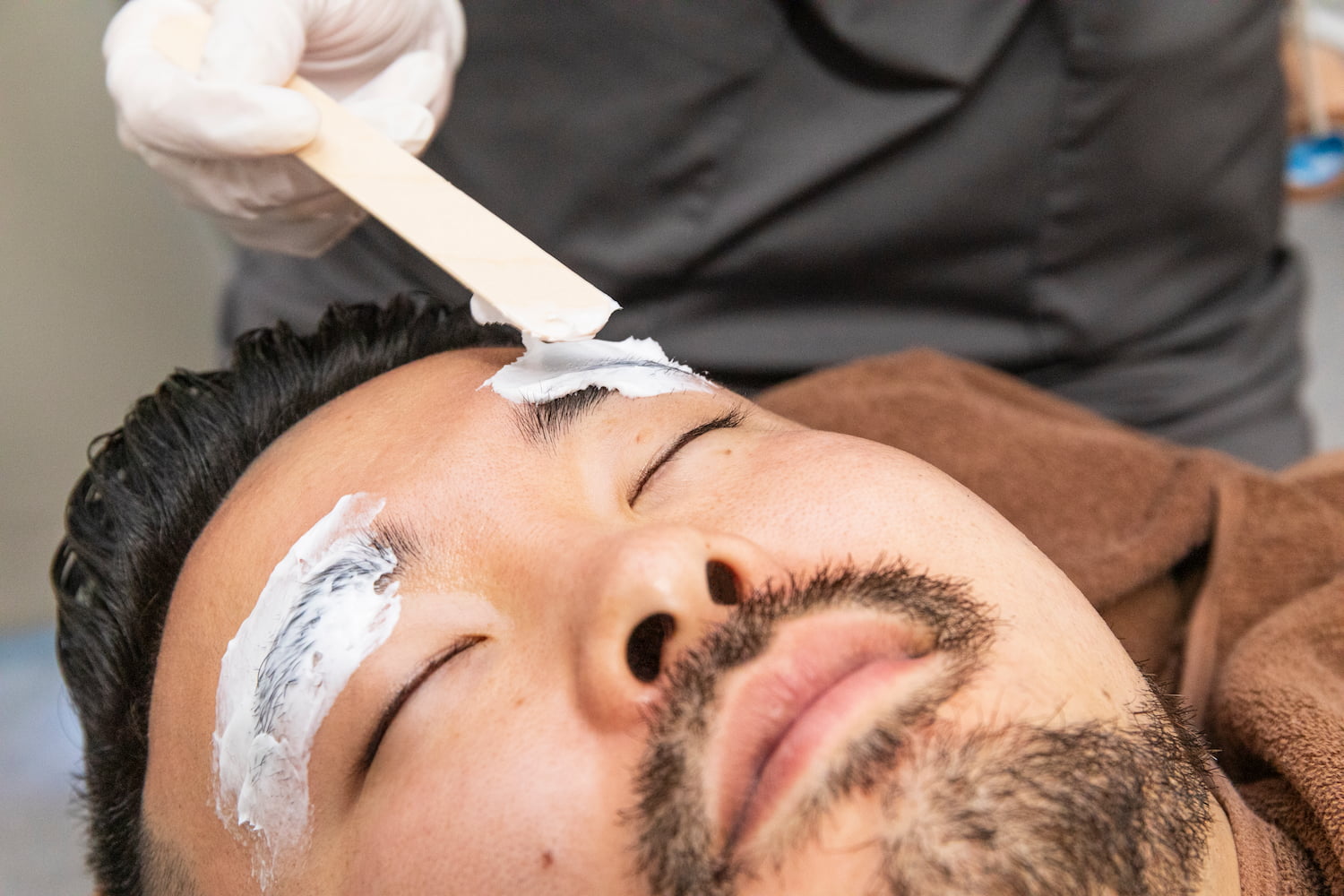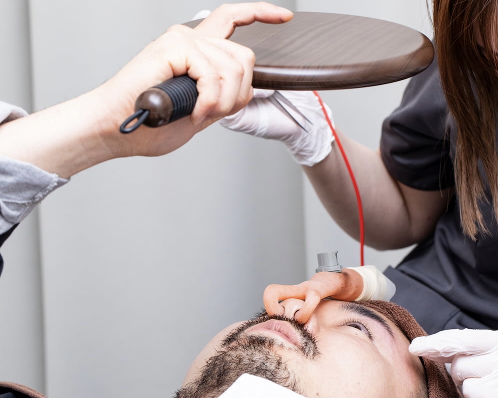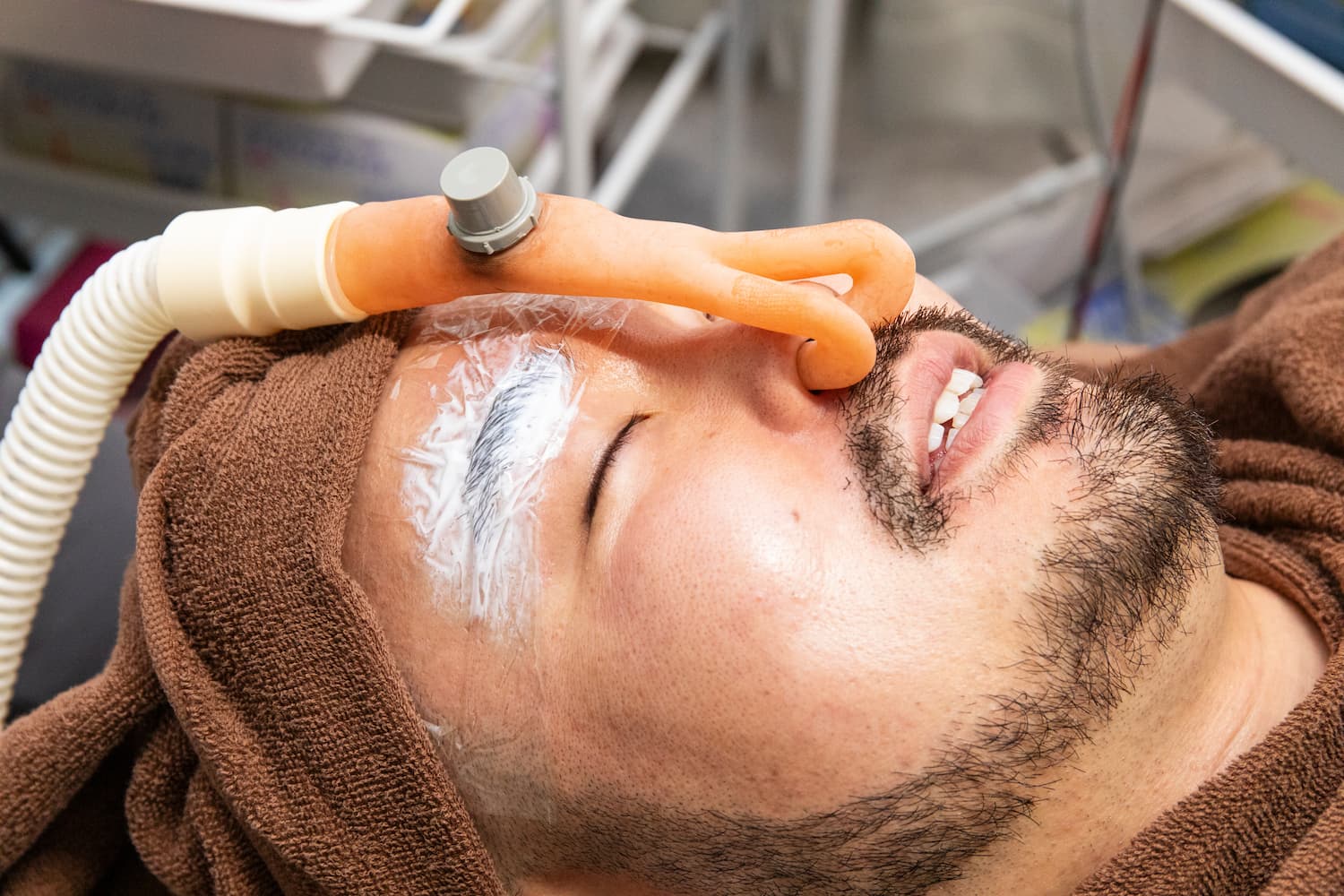 まずは麻酔クリームを眉毛の周囲に塗布し、皮膚の感覚を鈍らせていきます。さらに吸入用マスクを装着し、笑気麻酔を吸入。これにより、痛みを感じにくくし、安心して施術を受けることができるように。