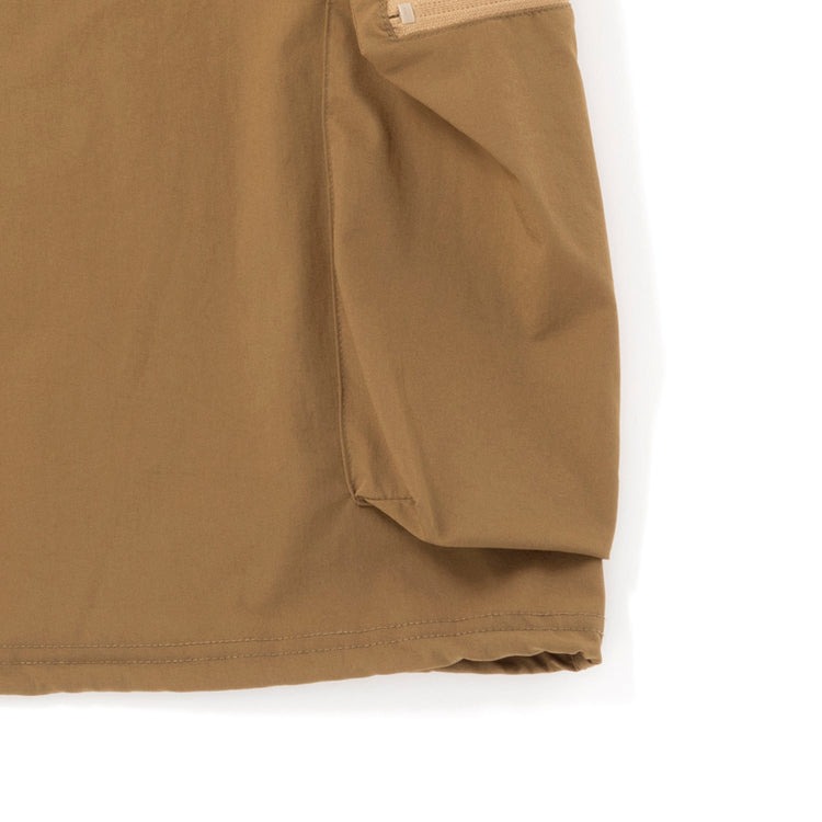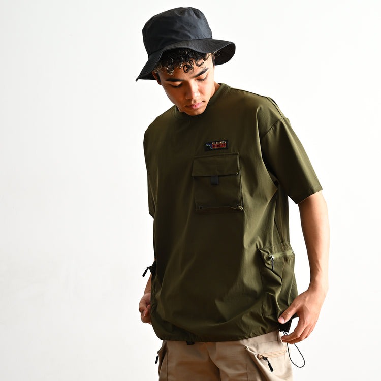一枚で存在感大のクルーネックTシャツ。伸縮性に富んだストレッチナイロン生地で動きやすさも備えています。左胸のフラップポケットと両脇の大容量の立体ポケットが着こなしのアクセントに。裾にはシルエットを調整できるゴムスピンドル入り。身幅が広いボックスシルエットで今らしく、ストレスフリーな着心地です。
