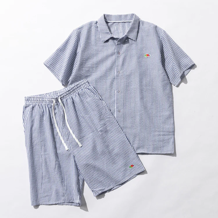 日中外にいる時だけだなく、家で過ごしている時や寝ている時間ですら暑い! 暑さに我慢できずに家ではパンツ一丁になる寸前という方もいるかもしれませんが、そんな方はフルーツオブザルームに別注した「軽くて涼しいシアサッカーセットアップ」を試してみてはいかがでしょう? 生地の表面が凸凹してシアサッカーセットアップなら、汗をかいてもベタつきにくく、サラッとした着心地をキープできます。爽やかなキャンディストライプ柄も夏にぴったりですし、何しろこれで5000円台で手に入るというコスパも魅力的なのです♪
