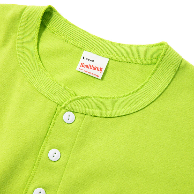ヘルスニットはヘンリーネックの元祖としても知られており、その伝統と品質をもとにした現代風のアレンジが感じられる一枚。シルエットはリラックス感のあるワイドフィットで、白の猫目ボタンやステッチワークなどヴィンテージらしいデザインは一枚でもサマになります。ワンポイントになるイニシャルロゴワッペン付き。シンプルながらも一味違うベーシックを楽しめます。夏に映えるネオンもおススメ!