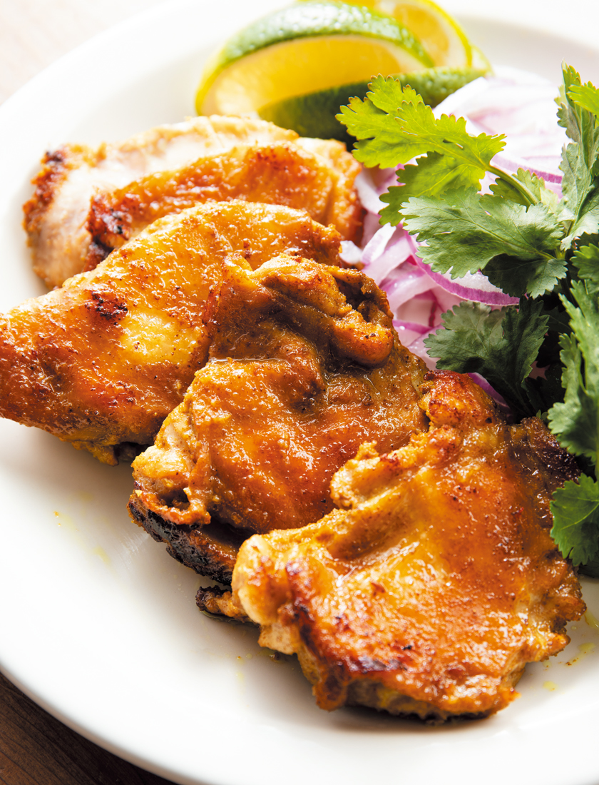 インドの焼き鳥、チキンティッカは、鶏肉をスパイス&ヨーグルトに漬けてからオーブンで焼く料理。タンドリーチキンと似ているけれど、こちらは骨付き肉で、チキンティッカは骨なし肉を使うので、手を汚さずにパクパク食べられます。
