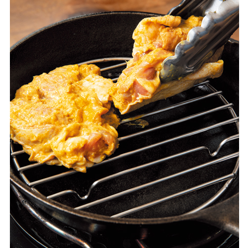 作るときのコツは、まず鶏肉を前日から漬け込むこと。ヨーグルトのすっぱさで肉が柔らかくなり、スパイスもしみて格段に美味しくなります。また底網を敷くのもコツ。オーブンのように熱がよく回り、まんべんなく焼けるうえに、余計な脂も落ちてヘルシー。底網はアルミホイルを丸めても代用できます。最後に底網を外して直焼きすると、表面はパリッ、中はジューシーという理想的な仕上がりに。