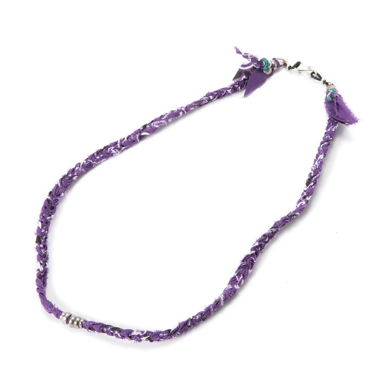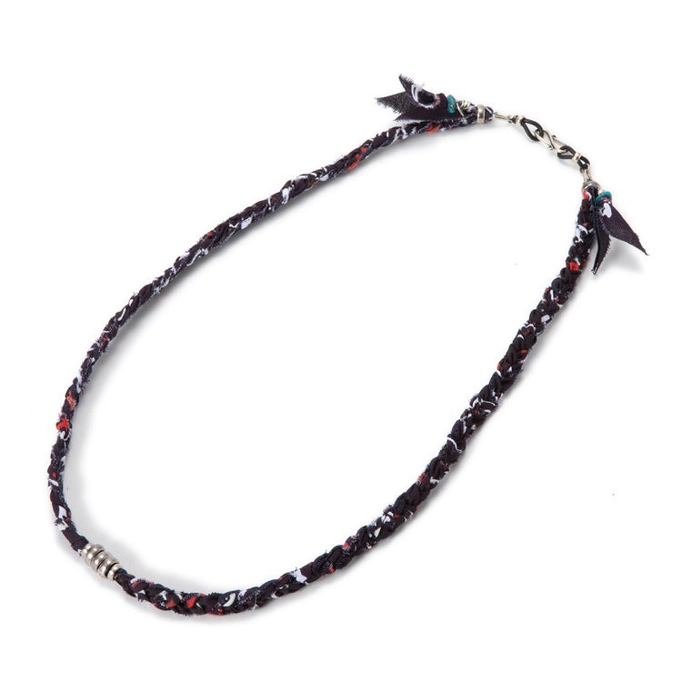 アメリカ製のバンダナを丁寧に編み込んで作られるサンクのバンダナネックレス。一昨年、昨年のこの時期に発売されビギンマーケットでも大人気の定番アイテムです。ただし今年の一本はひと味違う。なんと結合部にシリコン製のループが設けられたグラスホルダーとの2way仕様なんです!アイウェアのテンプル先端をこのループに通せば外したサングラスもアクセとして活躍してくれて、落としたり紛失したりというストレスともおさらば。
