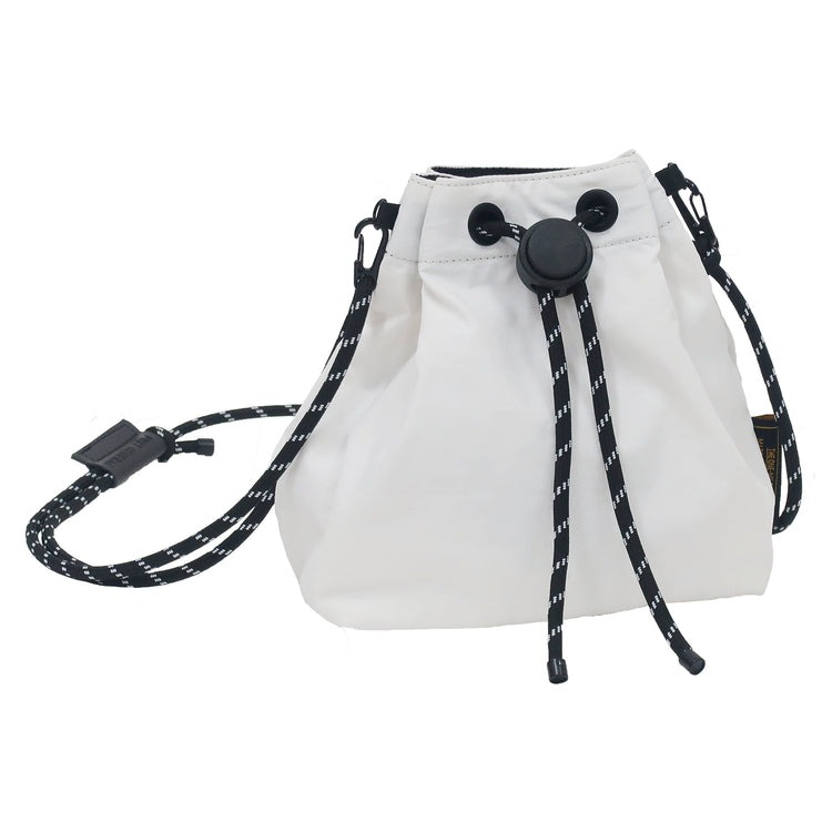 手持ちの巾着バッグとしても使える、2WAY仕様のショルダーバッグ。ボディには柔らかいナイロン生地、底面にはハリ感のあるナイロン生地を採用した、型崩れしにくいデザインです。スマホや財布などを入れるのに、ちょうどいいサイズ感も◎。