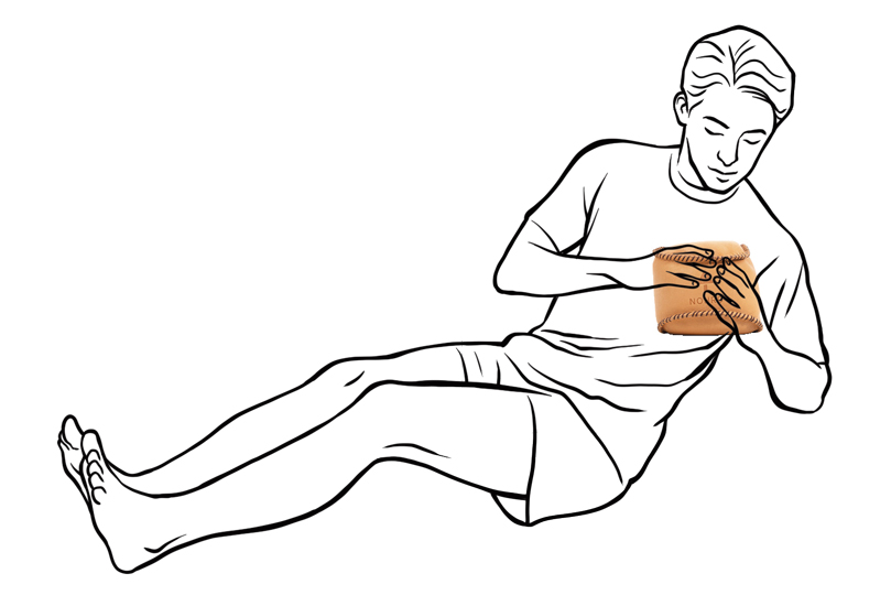 腰を反らさないようにおへそを覗き込みながら上体を後ろに倒し、かかとを浮かせる。そのまま上体を肩から左右に回転させるべし。