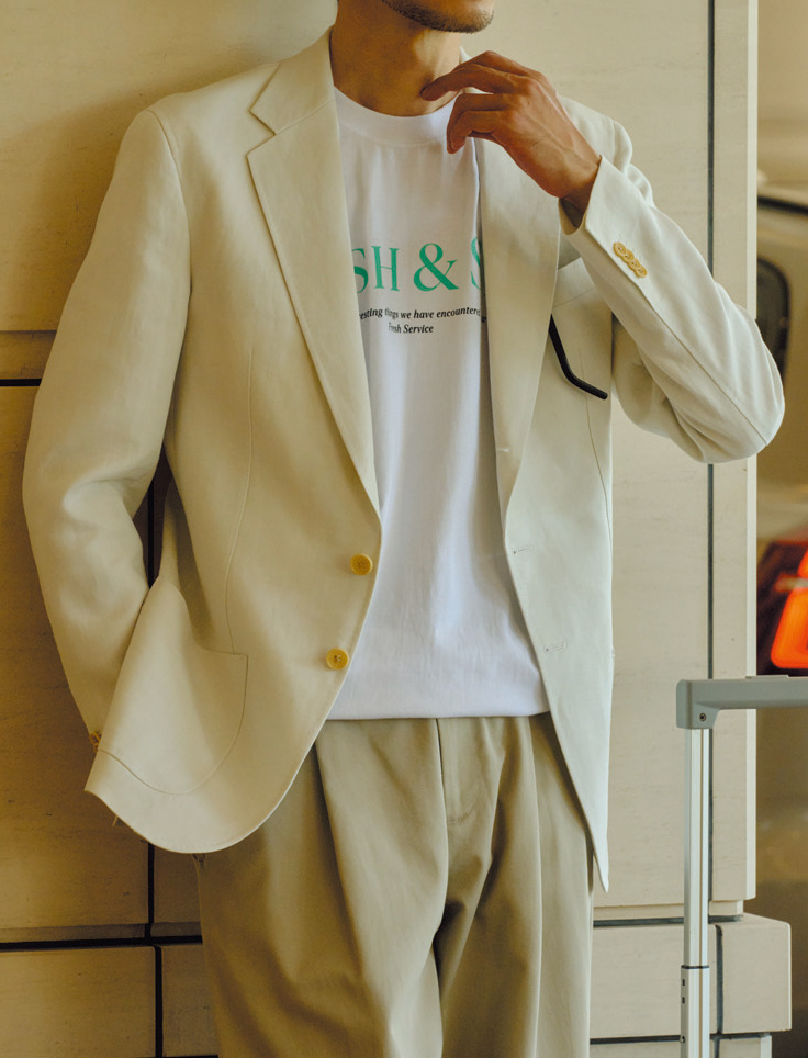 薄手の芯材を用いた軽やかな仕立てや、アイボリーに馴染む薄茶のナットボタン使いも、リネン特有のリラックスムードを後押し。プリントTシャツや同系色のワイドパンツとのくだけたコーデも、キマっているでしょ? クルマの窓に肘を掛けるような何気ない所作だって、自ずとサマになるというものです。
