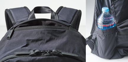 とまぁ、単に薄軽なだけのパッカブルなら他でも見つかりますが、真に驚かされたのはデイパックとしての完成度です。14インチ大のPCスリーブやドリンクや小物類を出し入れしやすいポケット類など、一般的なデイパック以上の使い勝手はモチのロンのごとくキープ。