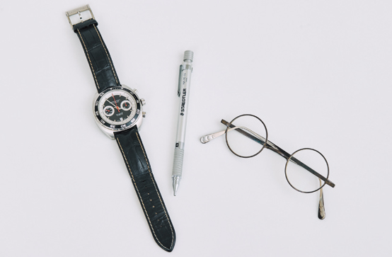 アンドウの三種の神器は、ハミルトンの復刻系クロノグラフ、ステッドラーのシャーペン、ゲルノット・リンドナーのメガネ。ステッドラーは2Bの芯を仕込んでおり、これでラフを描くと編集長チェックがスムーズにいくそう。メガネはルノアと同じデザイナーが手がけたもので、フレームは銀製。