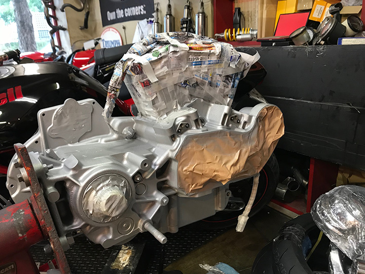 これが一応!? エンジンです。全体的にシルバーに塗装され、腰上はオーバーホール中なため、ホコリなどが入らないよう新聞紙とガムテープでグルグル巻きに拘束プレイされてました(笑)。このエンジンの写真だけで車種がわかりますか???