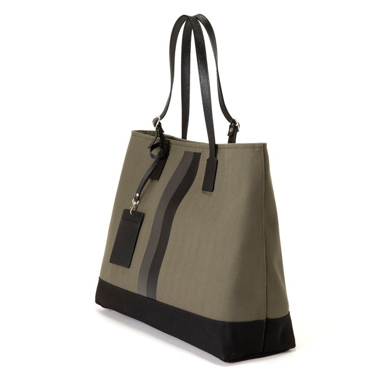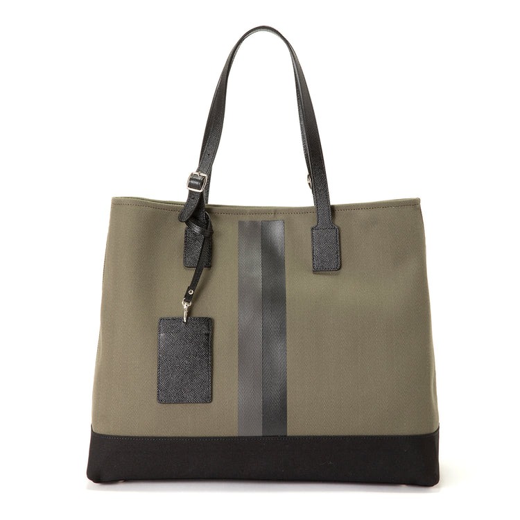 地中海のほとり、イタリアで作られたエレガントなバッグ……ではなく、こちらの生地は瀬戸内海を望む岡山県・倉敷の伝統的な「倉敷帆布」を使ったメイド・イン・ジャパンのトートバッグです。130年の歴史を持つ伝統的なシャトル織機によって織り上げられたヘリンボーン生地で、内側はコーティングをして汚れにくい特殊加工をプラスしています。付属のパスケースも良いアクセントに。