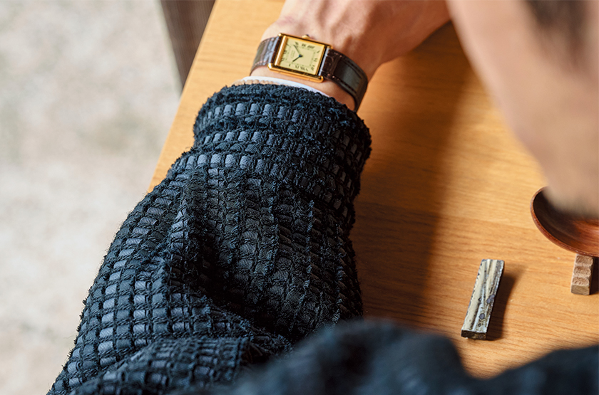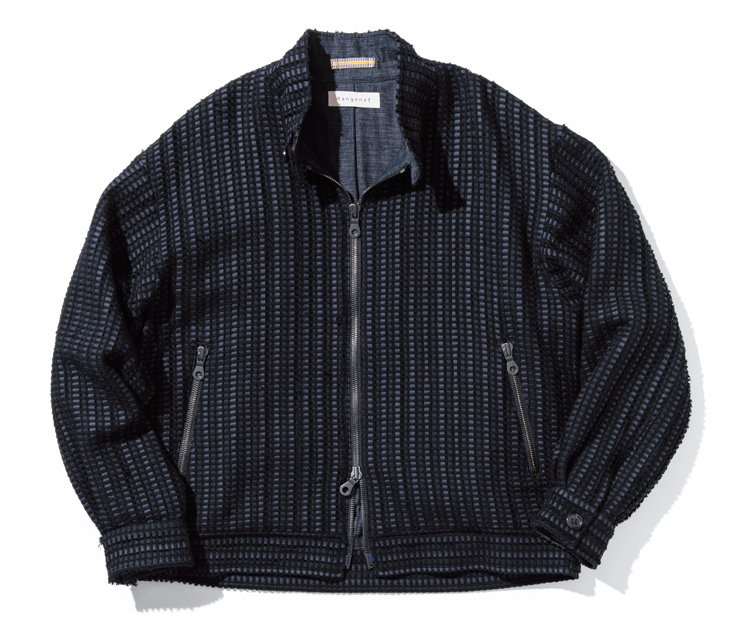 であれば、日本の伝統工芸をモダンに伝えていく盟主タンジェネットのハリントンジャケットを。廃棄していたはずの反物をテープ状の経糸にし、新たな織物へと再生する「裂き織」を用いた一着は、洋館リノベで新風を吹き込んだこの空間とウマいことリンクします。