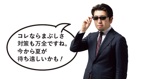 そこで「ナイト&デイ」なんです。カラーレンズ付きのフロントアタッチメントを装着すれば、あっという間にメガネがサングラスに!! 加えてアタッチメントには目に入る反射光をカットする偏光機能もプラス。たとえば車で営業先へ向かうときは、反射光がガンガン入る車内でも眩しさを抑えられ、大活躍することウケアイです。