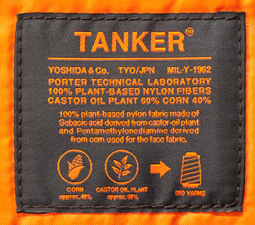 タンカーの顔たるナイロンツイル生地が、トウモロコシやヒマを重合・紡糸して作る、100%植物性由来のナイロンへと刷新されているんです。「当初は糸切れもしやすく、量産化には難がありました。そこで多くの時間をかけて改良を行い、量産化まで漕ぎつけたんです」。