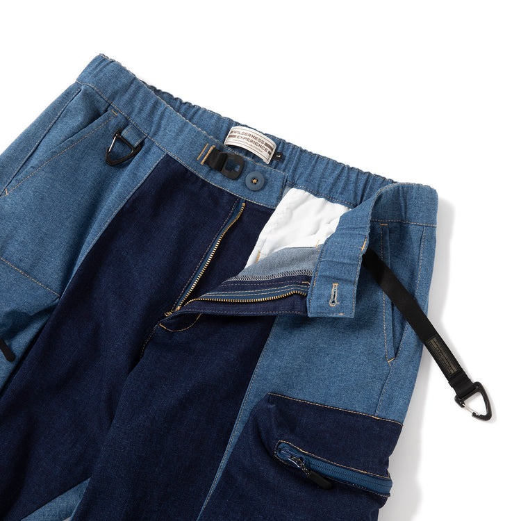 ストレッチデニム生地を採用したクライミングタイプのカーゴパンツタイプの本作。大容量の立体ポケットと小物を収納できるポケットが豊富で実用性も確保! さらに、ウェビングベルトを搭載しておりウエストのサイズ調整も楽チンです。すっきりと穿けるスリムシルエットでいながら、大胆かつクレイジーな切り替えがコーデのアクセントに◎。