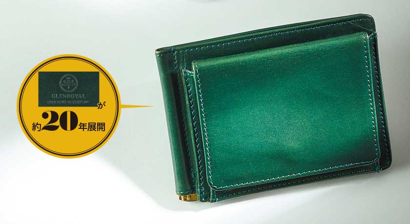 良質なブライドルレザーを使いつつ、約1.5cmの薄マチを実現した小銭入れ付きマネークリップ。それでいてカードポケットやコインケースを計7カ所も装備するなど実用面も文句なし。こちらで登場した渡辺さんの愛用品でもあり、約20年は展開されているという大定番だ。W12 × H9 × D1.5cm。3万8500円(ブリティッシュメイド 青山本店)