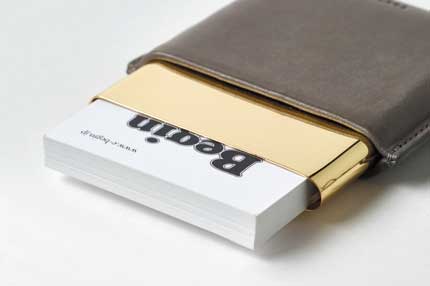 古きよき時代のタバコケースをモチーフにしたカードケース。手作業で作成された真鍮の収納部分を覆っているのは、フランス製の羊革。しっとりとして柔らかく、吸いつくような手触りが魅力だ。収納部分には名刺を30枚程度収めることが可能。名刺交換の時にサッと取り出したら、商談相手に一目置かれる!? W7 × H12 × D10cm。2万9700円(カナル)