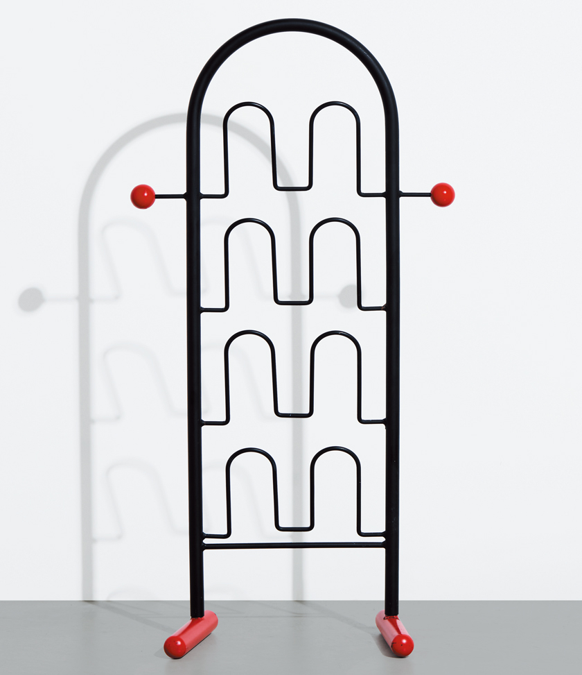 おそらくスチール製のフレームに4段8箇所のフックを設けたスリッパ用ラック。流線がメインのフォルムや赤の利かせ方など、デザイン的なアプローチが目立つものの、銘や刻印などの類は一切なく、出自は不明。