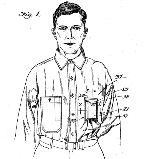 下一枚目の写真は1929年に申請された、ビッグヤンクによるシガレットポケットの図案。当初はボタンのフラップ留めで、フラップを開けずに脇からボックス内のタバコを取り出せる設計だった。左右の大きさの違うガチャポケはこの頃からで、やがてフラップなしの山ポケへと発展。一回り大きな右ポケにはペン差しが備わる。