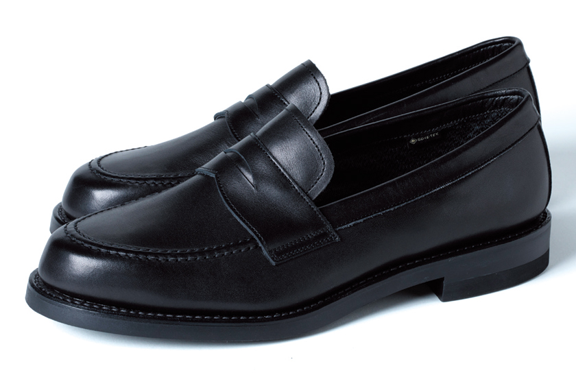 そんなワケで、日本の気候にフィットしたゴアテックスローファーの出番です。「これがゴアテックの防水仕様だなんて、見ただけじゃ絶対に分からない。UA別注だからこそのシャープなツラ構えで、レザーシューズの大人っぽさはむしろ倍増してますし」。