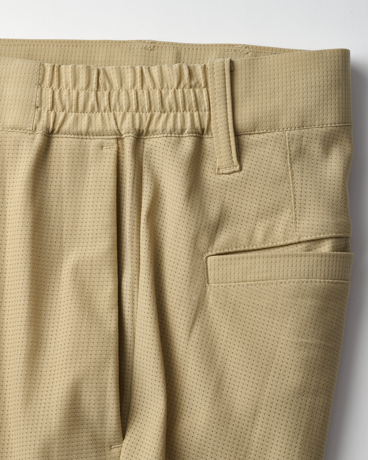 両脇にゴムを取り入れたことで、スイングや座ったり立ったり動きが多いゴルフ中でもズレが少なく、程よいホールド感をキープ。トップスをインすればきれいめにも寄せられ、シャツアウトならリラックスムード全開で楽しめます。また、ドローコードでウエストを調整できるので、ベルトなしで履けるのも嬉しいポイントです。