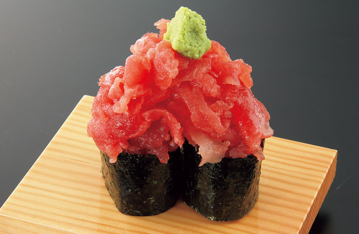 「マグロの中落ちのすき身が2カン、これでもかと盛られて、たったの100円!! いわゆるねぎとろ軍艦ではなく、マグロの中落ち100%なので、味も格別! これが100円だなんて……回転寿司の七不思議の一つであります。」(米川伸生さん)