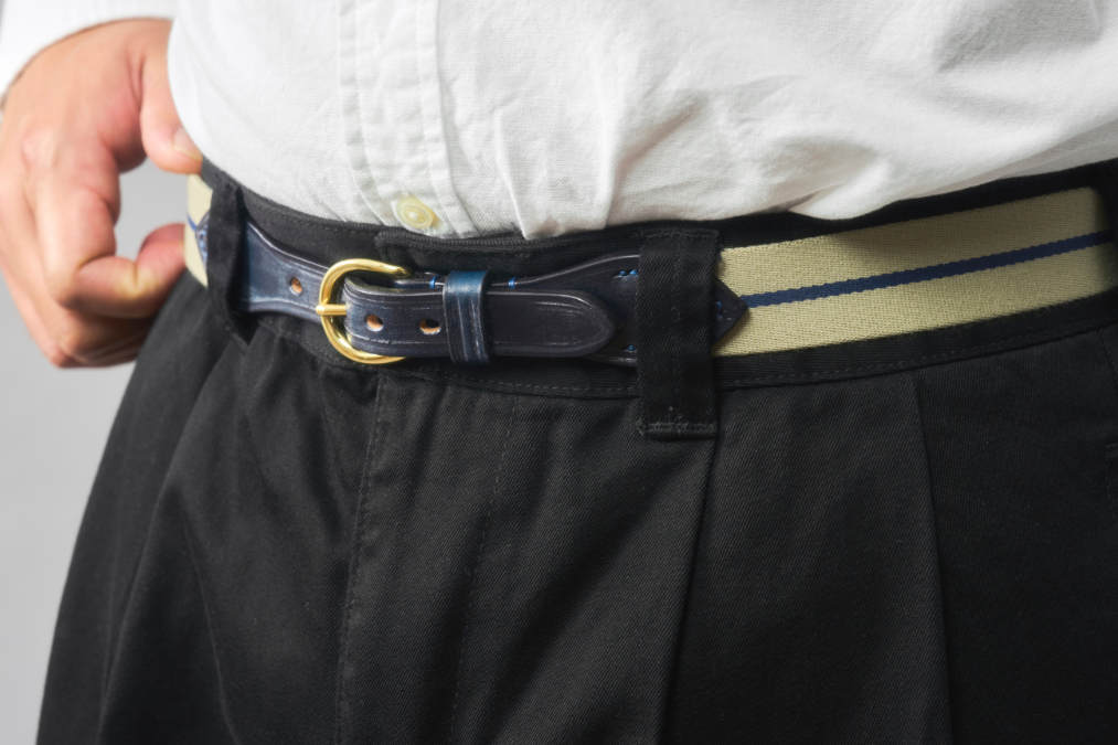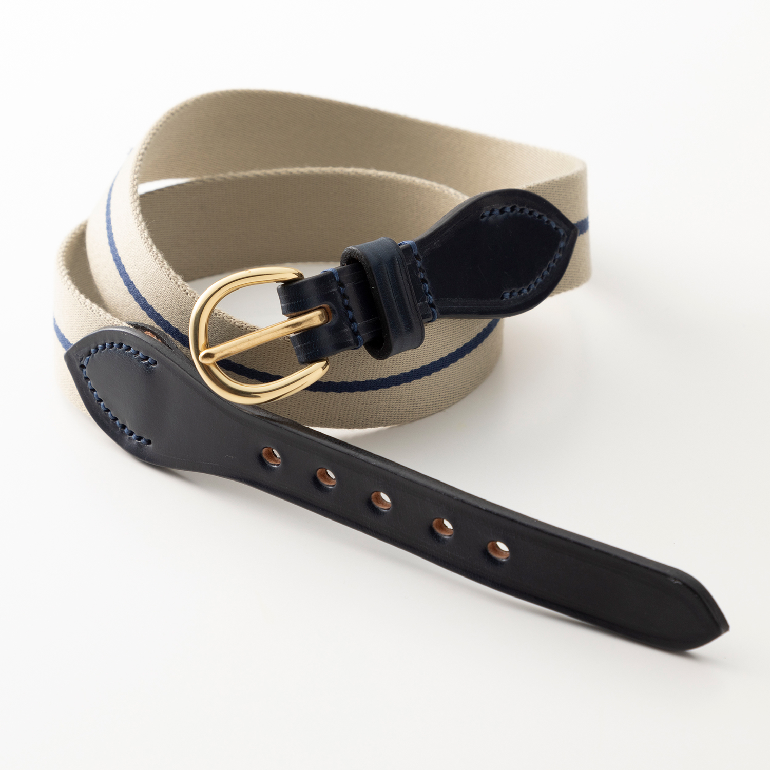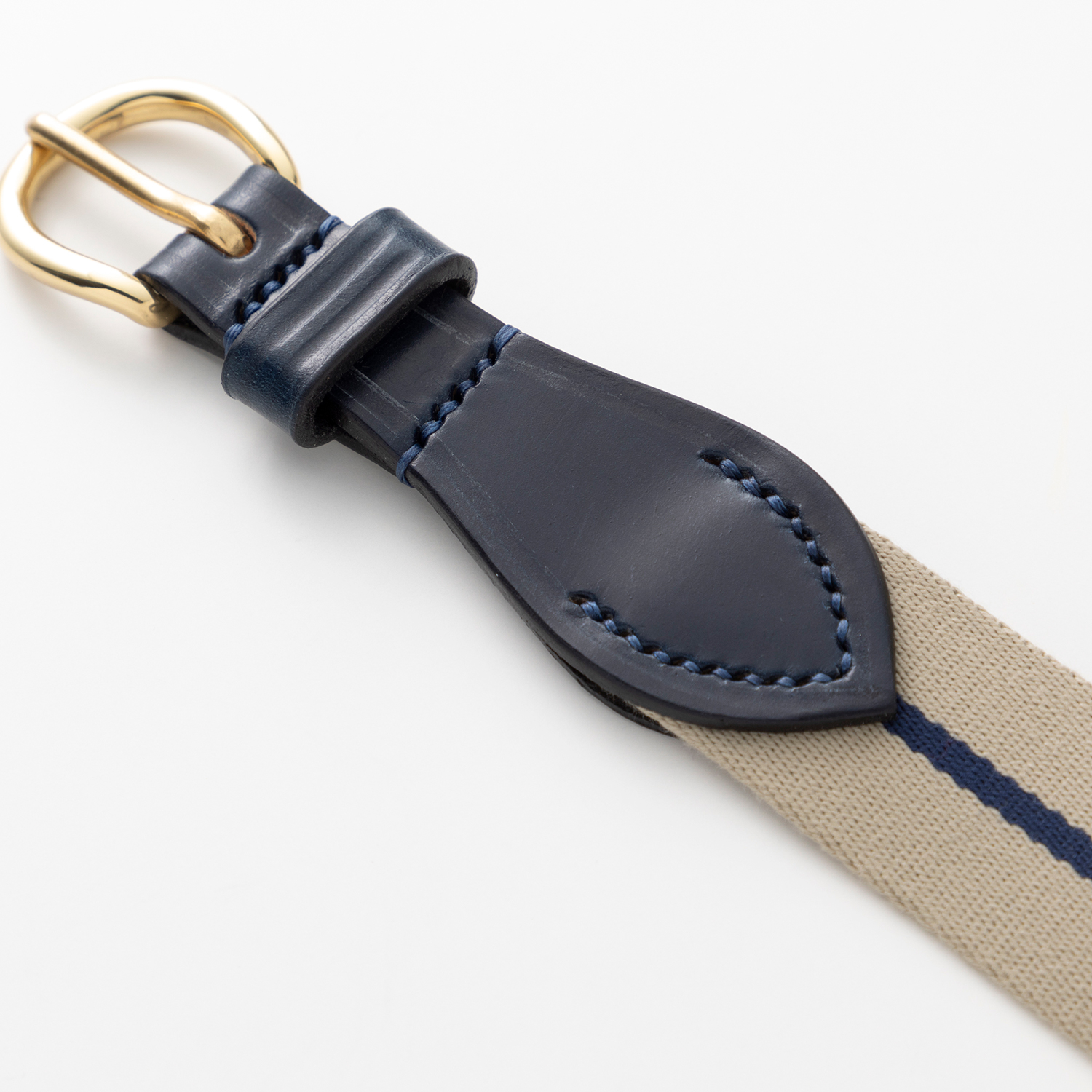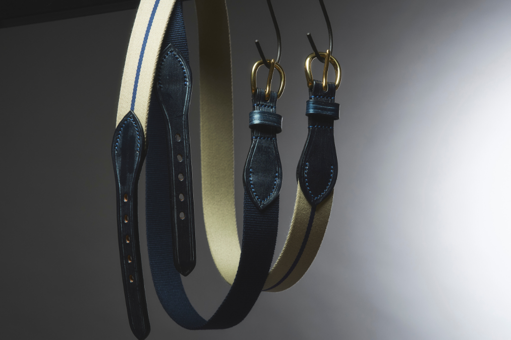 キャンバス地のリボンベルトとブライドルレザーのコンビネーションが美しいベルトは、オンオフ問わず使えるよう、レザーをネイビーに別注。丁寧な仕事ぶりが伺えるハンドステッチは、熟練の職人によるオールハンドメイド。