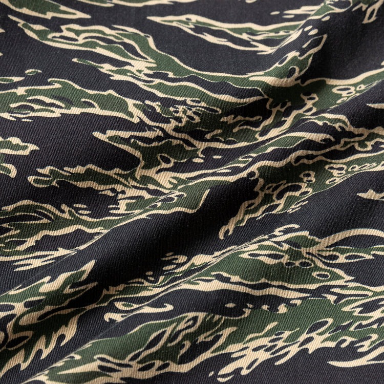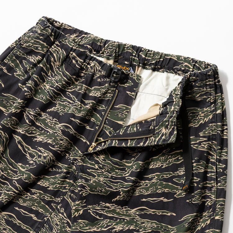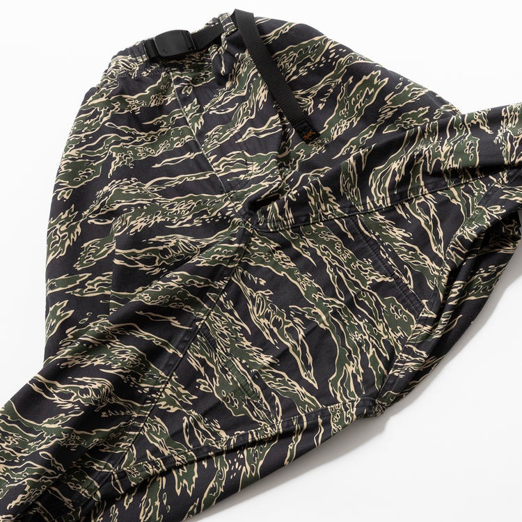 テーパードラインでスッキリ見えて、ストレッチ入りのツイル生地と180°開脚のガゼットクロッチは動きやすさ抜群。カモ柄のアクセントもポイント高し!