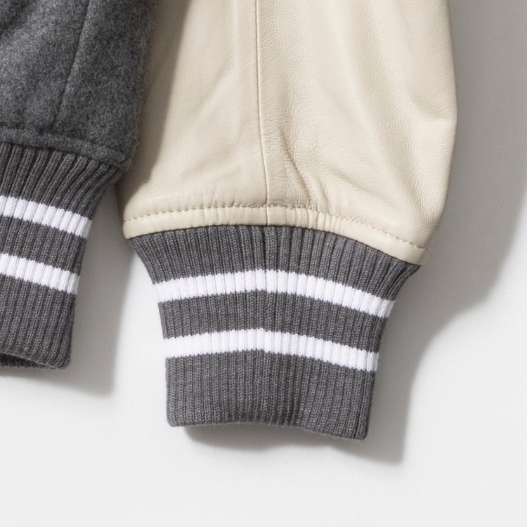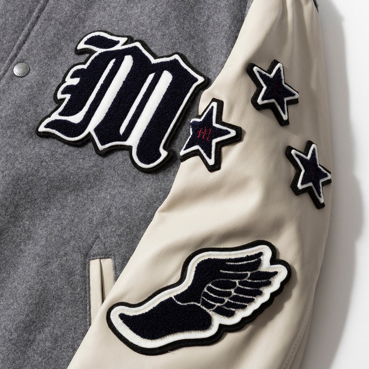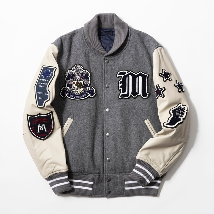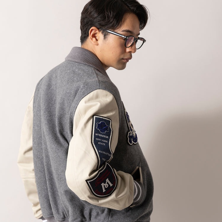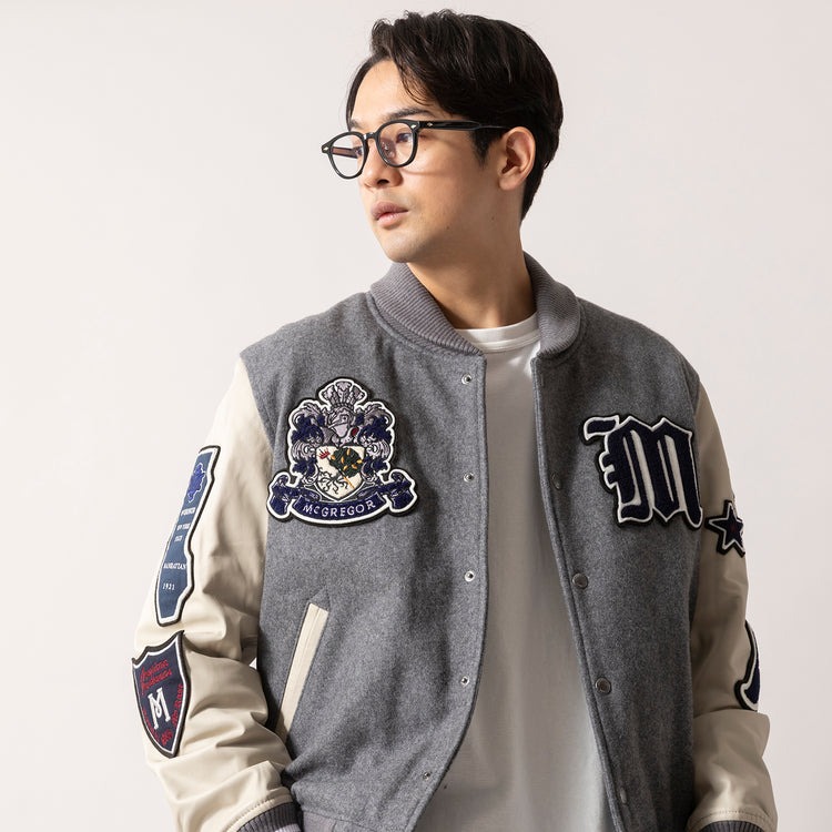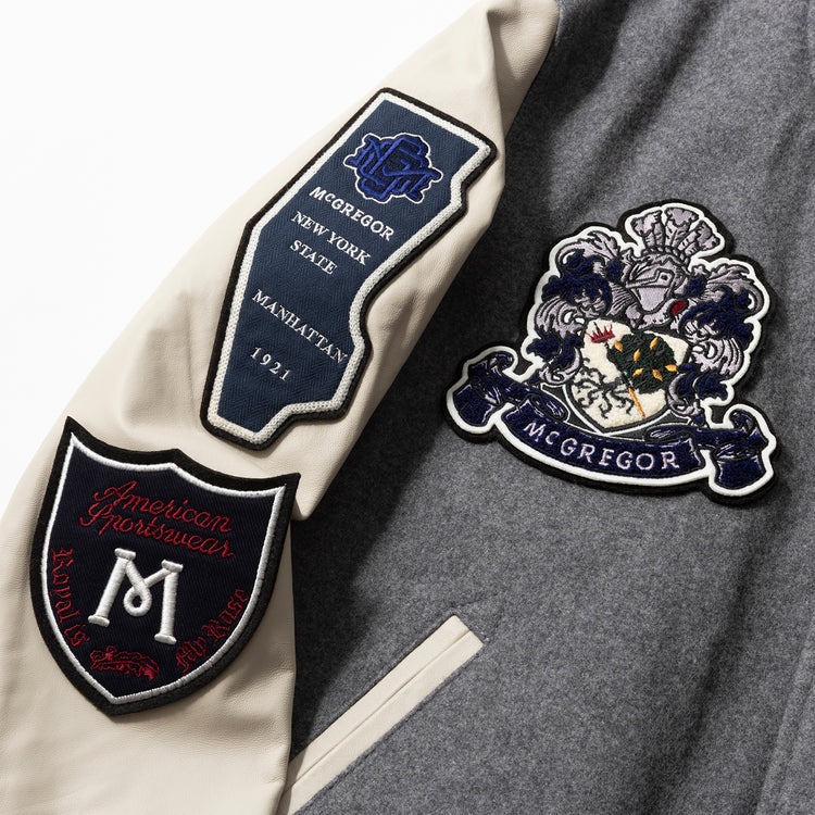 マックレガーブランドの世界観を体現するこちらの袖革アワードジャケット。クラシックなクレストワッペンを中心に、ブランドに所縁のあるディテールを採用しています。袖はしなやかな風合いのラムレザーを使用し、高級感のある仕上がり。