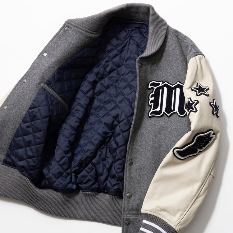 中綿キルト仕様で防寒性も備えた、秋冬シーズンに重宝する一着。日本製のワッペンモチーフを配し、上質感をアピール。シックなグレーのスタジャンは、合わせやすいので大人のワードローブに是非 ♪