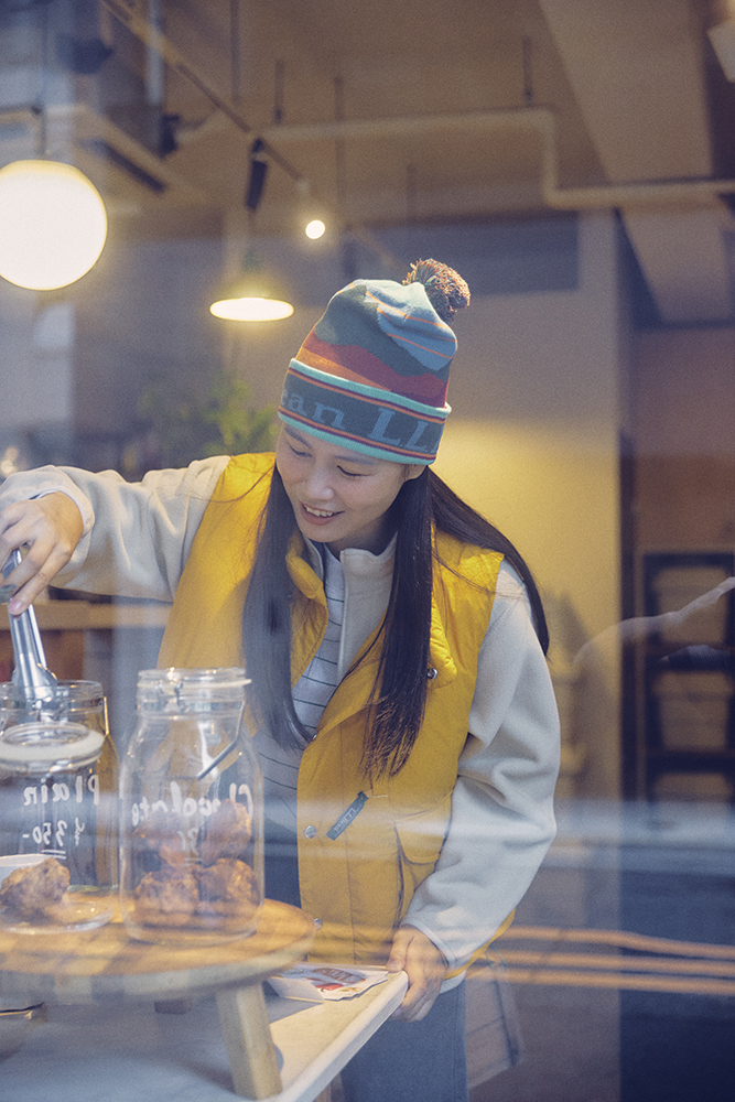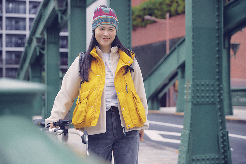 普通のダウンとは違って、自転車を漕いでも暑くなりすぎないところが嬉しいですね。機能はハイテクなのに見た目はクラシックなデザインだから、自転車を停めて街を歩くときも、お店に入ってもお洒落に馴染みます。