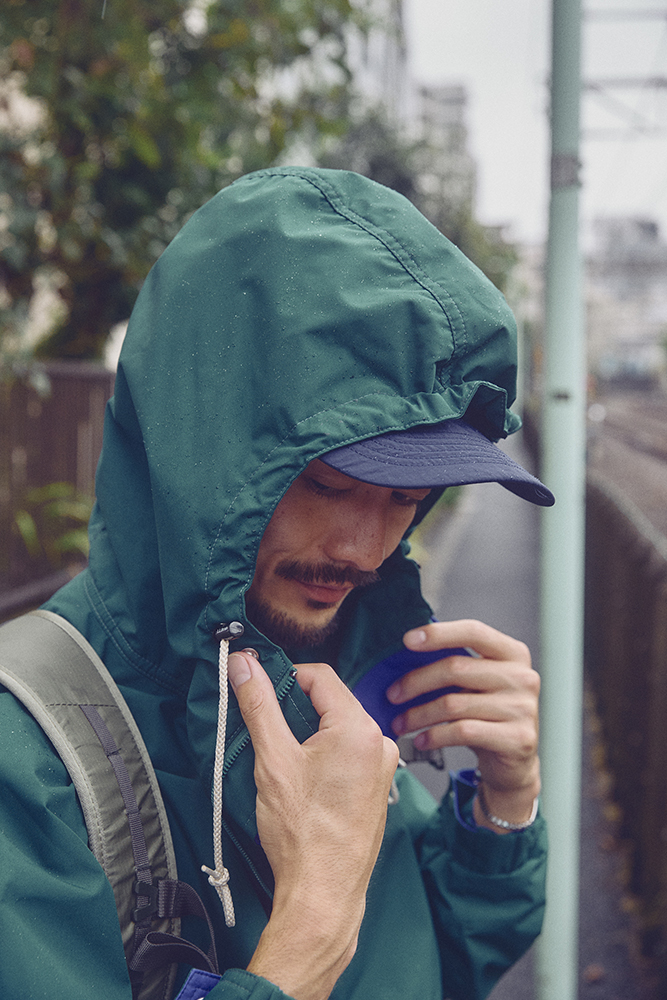 胸から背中、袖までが一枚の生地でつながったパターンワークが特徴で、肩の縫い目から雨が浸入するのを防ぎつつ、腕の動きを妨げない。