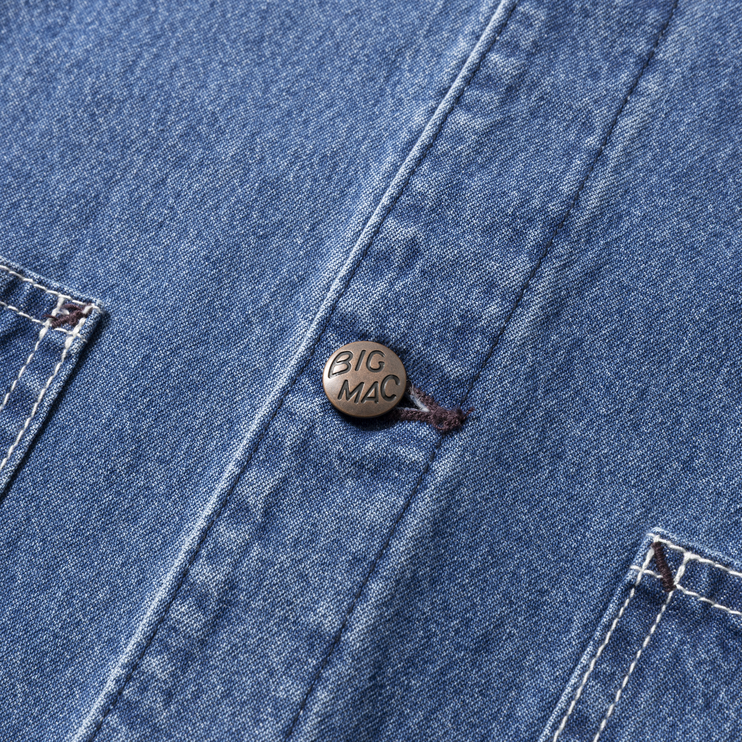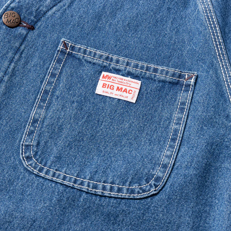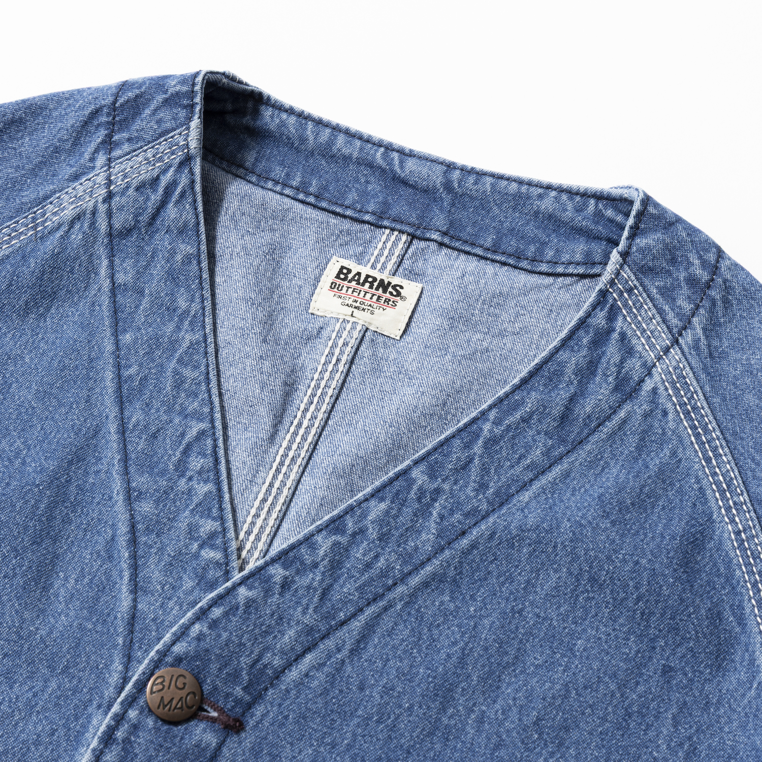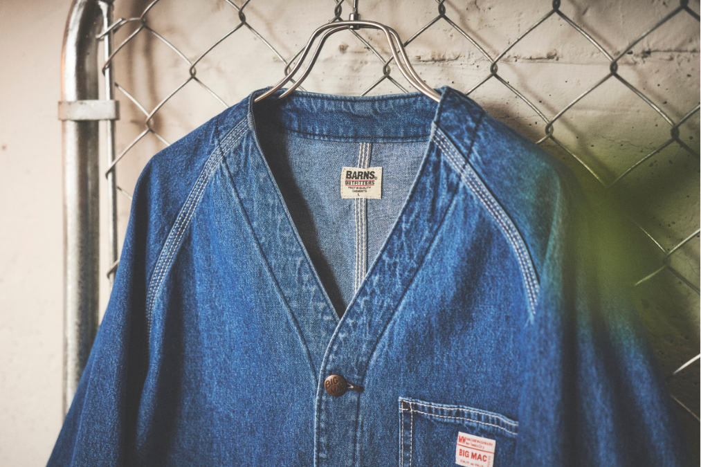 パッカリングのきいた味のある表情を加工で表現。「BIGMAC」の刻印入りボタンが光ります。首元には「BARNS」、胸元には「BIGMAC」両者のタグがコラボの証として鎮座。特別感もたっぷりな逸品です。