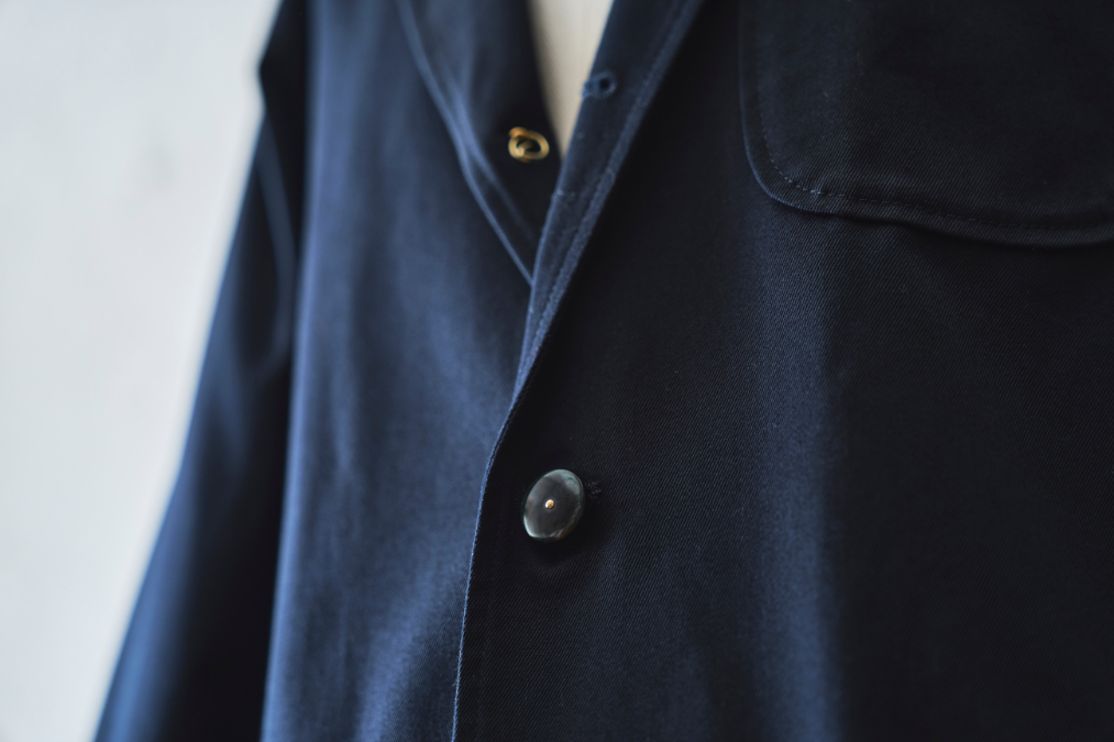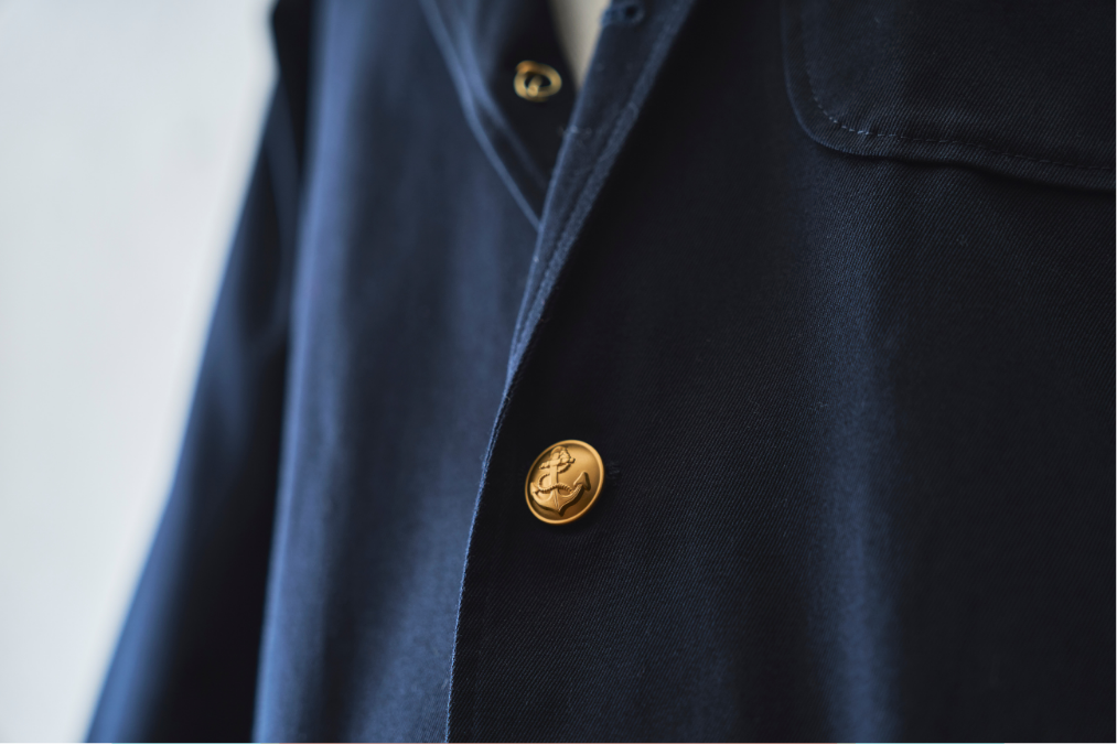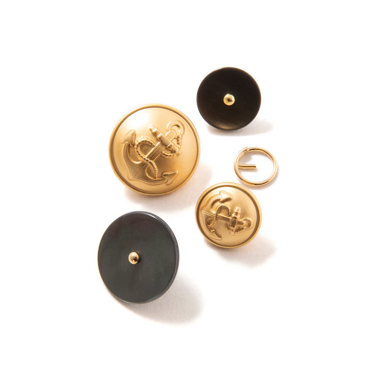 古いミリタリーウェアにみられるチェンジングボタンを採用。錨の刻印入り金ボタンと黒のシェルボタンの2種類が付属するので、コーデや気分によって簡単に変えることができる。