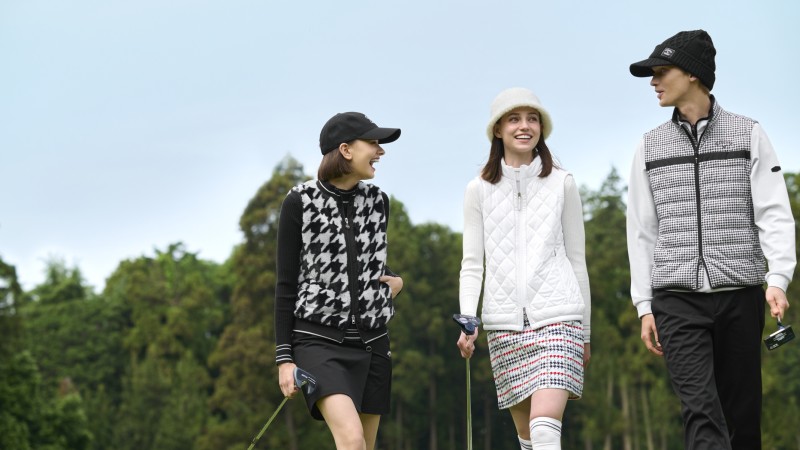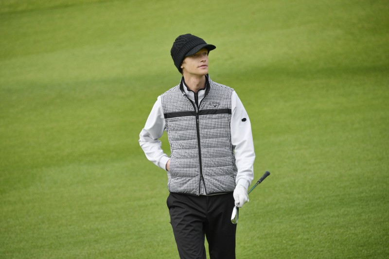 メンズからはこちらの中綿ベストをチョイス。千鳥格子のクラシックな柄ながら、胸に一本のラインをあしらうことでゴルフウェアらしいスポーティなテイストに仕上がっています。ポロシャツをインしたニットの上に着れば、初冬までOK! もちろんベストなのでスイングのしやすさも言う事無しです。実はこちらは、袖を装着して長袖にもできるすぐれもの。詳しくは10月23日公開の63打目で紹介しますのでお楽しみに!