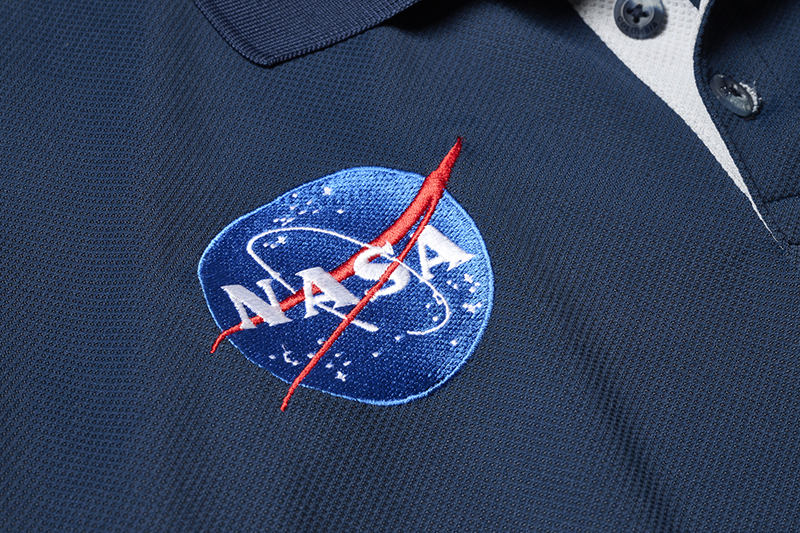 上のクエスチョンへの返答!とばかりに、サービス精神溢れる優しい野口さんが持参してきてくれたのが、「大のお気に入り」と語るコロンビア社製のポロシャツ。右胸に輝くのはNASAのロゴ!