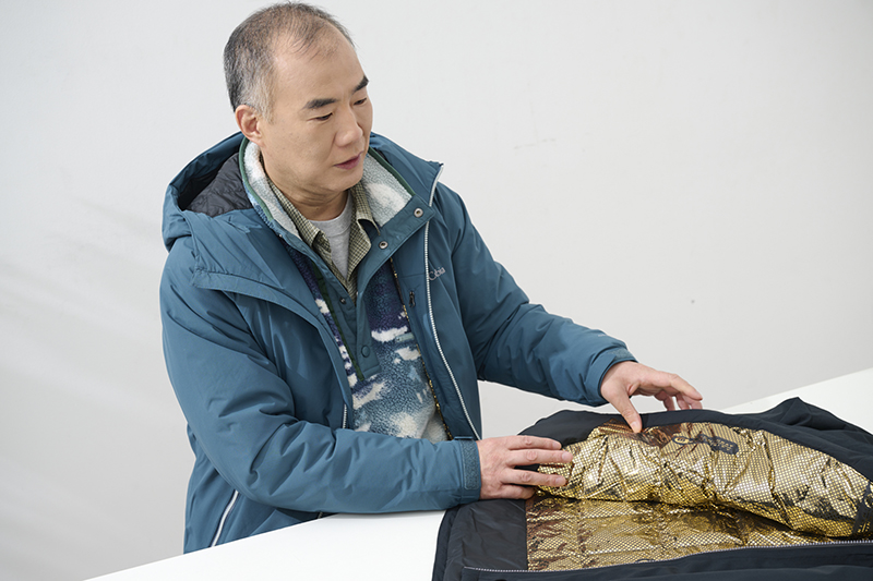 「しっかりと体熱を反射してくれるので、軽いのに暖かいですよね。もう期待通り! オムニヒートインフィニティは、実はNASAのアポロ計画の過程で生まれたスペースブランケットが元になっています。いわゆるアルミ蒸着のテクノロジーで、発想自体は実は何十年も前からあるんですよ。緊急避難用のブランケットなどで実用化されています」。