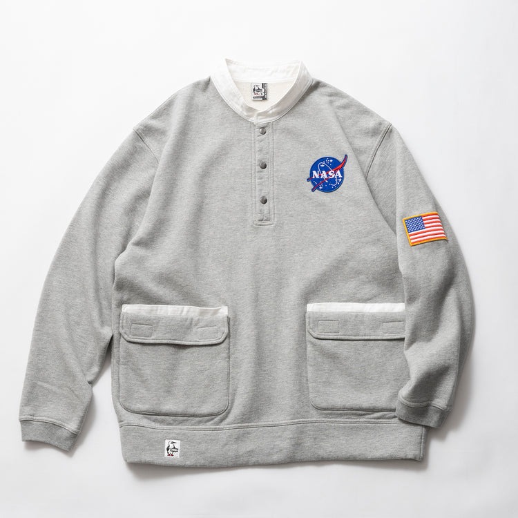 “宇宙は究極のアウトドア”! その発想にニヤリ。チャムス×NASAの「Space Hurricane Top」は、ハリケーントップのスタンドカラー&前ボタンは踏襲しつつ、胸にNASAワッペンと宇宙服を彷彿とさせる多重ポケットで機能を搭載した一着。まさにスペースワイドな遊び心が加えらえているのです。「それ何のスウェット?」と聞かれること間違いありません!