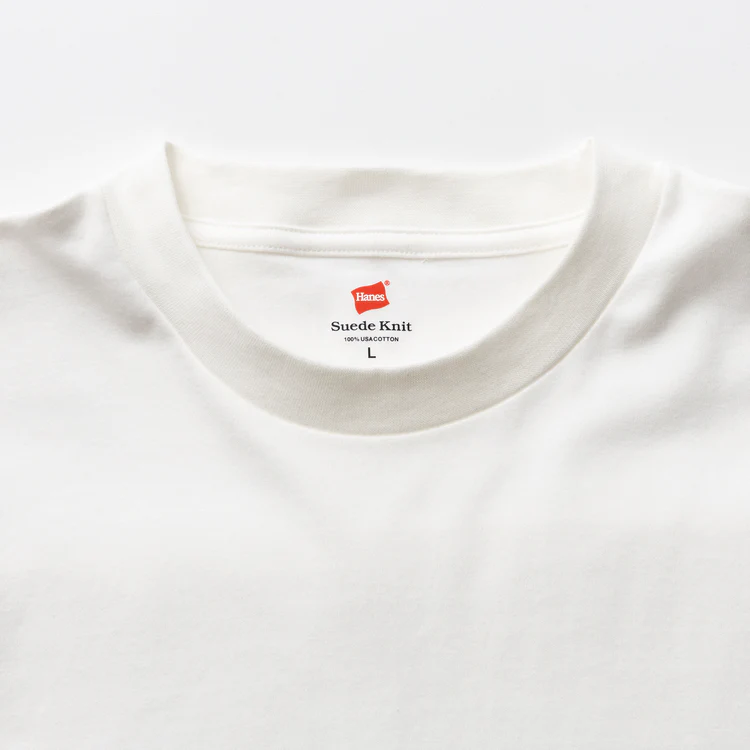 スエードとは、なめした革の裏面(床面)をサンドペーパーなどで細かく起毛させた皮革のこと。柔らかく滑らかな手触りが特徴で、秋冬シーズンに多数用いられる素材です。そんなスエードライクでシルキーな肌触りをアメリカ綿100%のロンTで実現したのが、ヘインズのスエードニット クルーネックロングスリーブTシャツです。