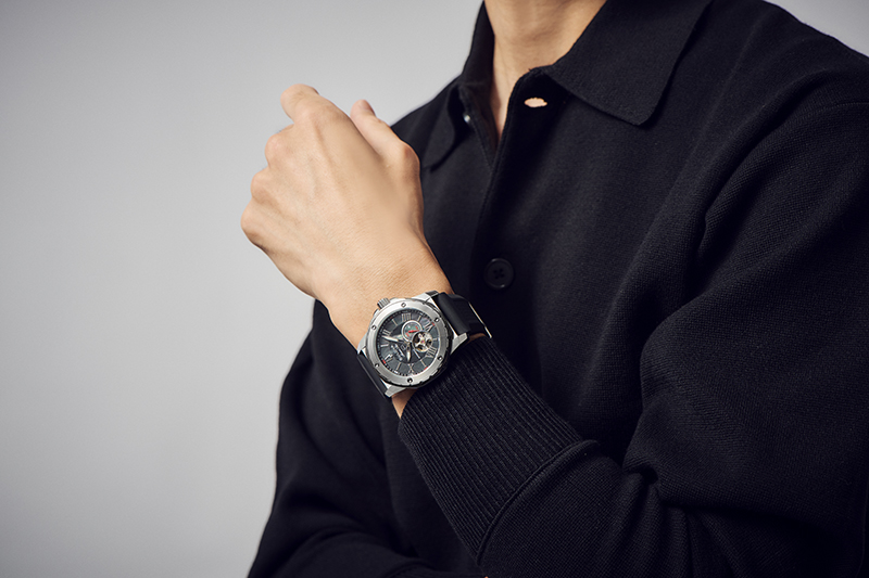 45mmのステンレスケースはベゼルを6本ビスで固定し、要所にダークグレーPVDパーツを施して無骨な印象に。20気圧防水とラバーストラップでタフに使え、デイリーウォッチとしても申し分ありません。