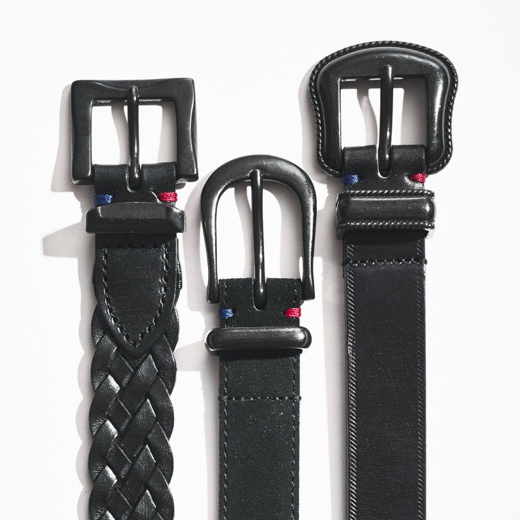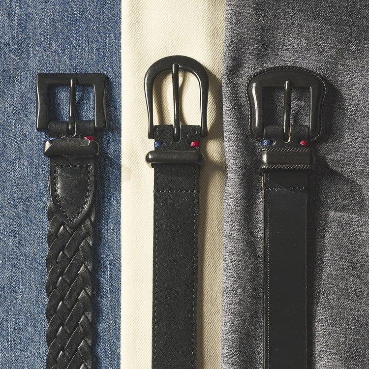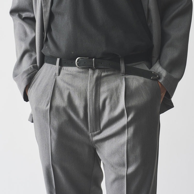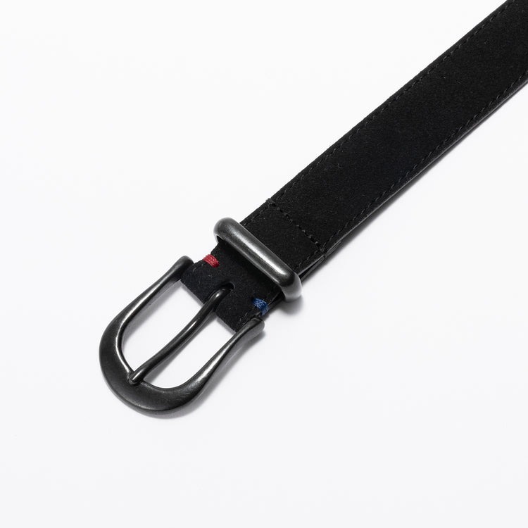 ビジネスのカジュアル化が進むいま、カチカチのフォーマルレザーベルトが浮いてしまう………。そんなときには、トゥエルブセブンに別注した「 “世界の名革” エブリデイプレミアムベルト」をおすすめいたします。イギリスのリーズで1904年に創業した老舗タンナー、チャールズ・F・ステッド社のスーパーバックを用いた本作は、スエードがきめ細かくとても上品。それでいながら程よく厚みがあってカジュアルな雰囲気で取り入れられます。オールブラックの2.5cm幅でジャケパンにもデニムとも好相性。ブラックスエードのドレス感と、剣先にさりげなく付けられたプンターレや着用時に隠れる赤青ステッチのカジュアル感のバランスが絶妙。オン・オフで兼用できて、“週7”で大活躍してくれます!