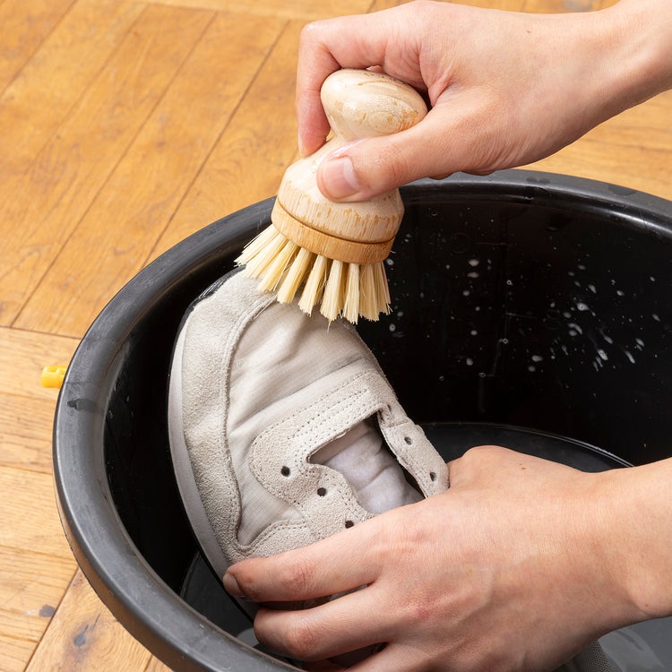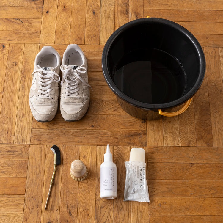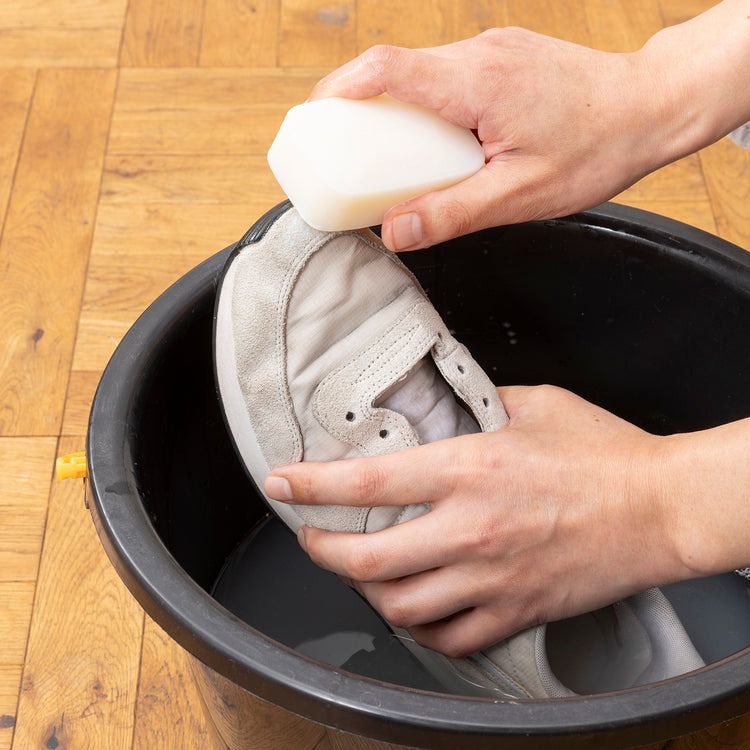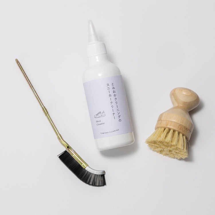 洗剤のほか、スニーカーの洗浄に適した専用のブラシと汚れが落ちない箇所に洗浄力に特化したエリそで用固形石鹸も推奨しています。ブラシは靴の隙間やつま先などに詰まったごみをかき出すための靴用すみっこブラシの他、全体のこすり洗い用に洗濯用ササラブラシも取り揃えており、スニーカークリーナーと併せておすすめしています。