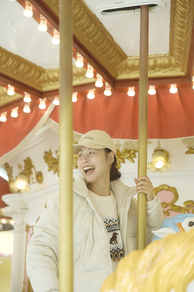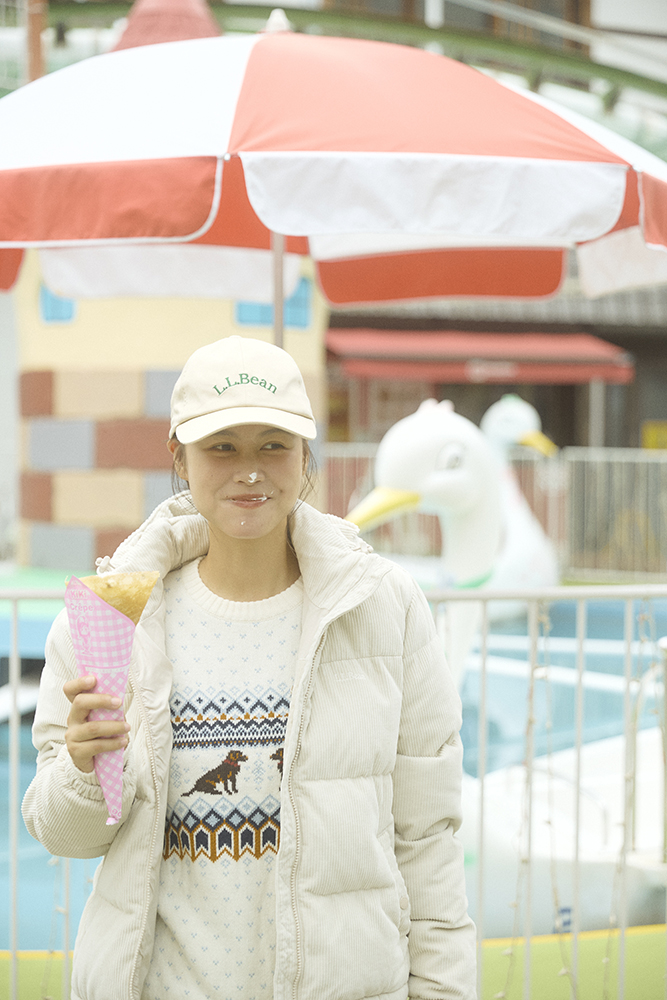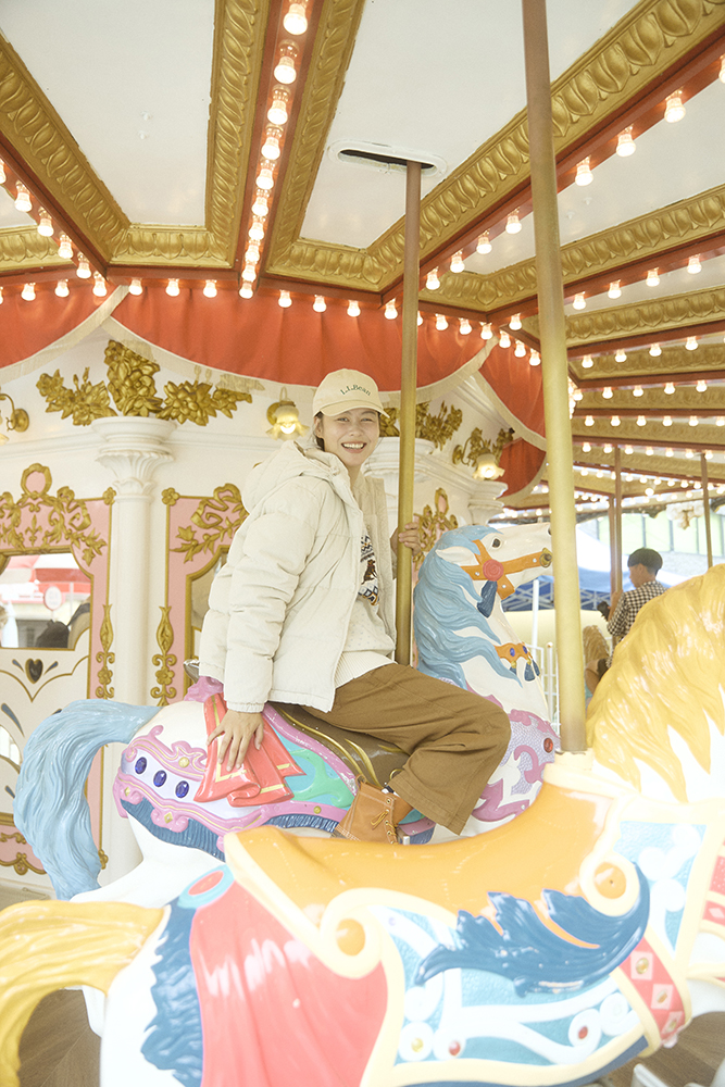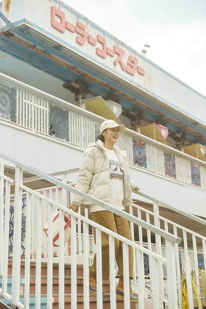 しかもクラシックに見えても高機能なダウンテック™ダウンが使われていて、家庭で簡単に洗えると伺いました。だから、汚れを心配してしまう白いアウターでも気兼ねせず着られるし、クリームたっぷりのクレープだって心置きなくかぶりつける(笑)。というわけで、この後も引き続き全アトラクション制覇を狙います!