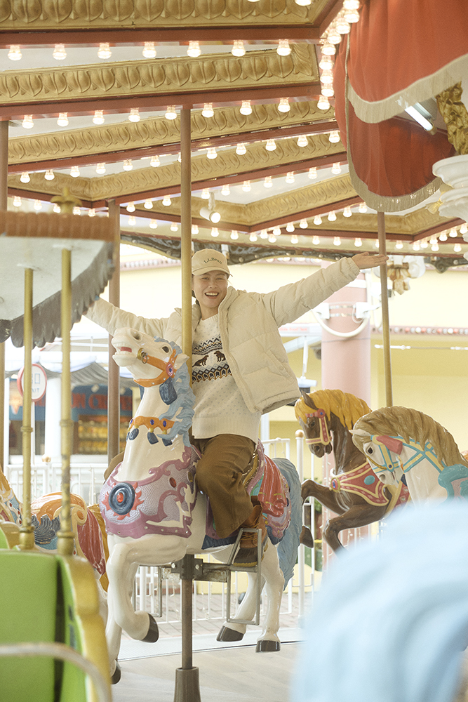 寒いとローラーコースターやメリーゴーランドに乗るのも凍えそうになるし、遊ぶどころじゃなくなって十分に楽しめない。このジャケットはダウンがいっぱい入っていて文句なしに暖かいし、柔らかくて着心地がよくノンストレス。おかげでアトラクションに全集中できます(笑)。
