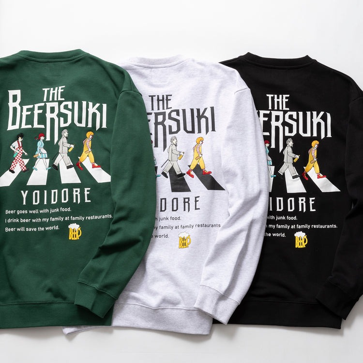 終電前のもう一杯がいちばん旨い。そんな気分を背中でアピールしてくれるのが、ロックアート風グラフィックに胸の「11:59」を効かせた、ヨイドレの「BEER SUKI クルーネックスウェット」です。日付が変わる寸前までビールを楽しむ合図に、思わずニヤリ。プリント物は差別化が命ですが、これは酒場でもフェスでも主役級。某レジェンドを思わせるおちゃめなムードもご愛嬌。今夜はこの一枚で、気持ちよく乾杯しませんか。