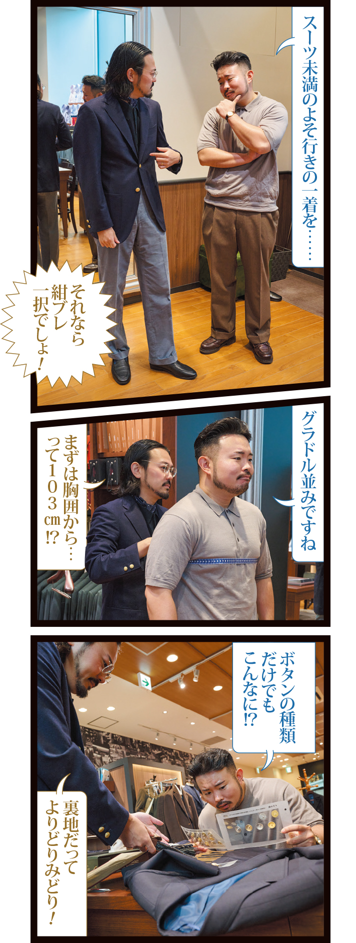 「細かな採寸で体型の微妙なクセまで反映してジャストフィットを作り上げるのはもちろん、数百種類の生地選びから細部のデザイン仕様まで多彩にオーダー可能。それでいて3万1900円~は本当にお値打ちかと。一度袖を通せば、間違ってなかったと納得できるとお約束いたします!」(プレス篠塚さん)