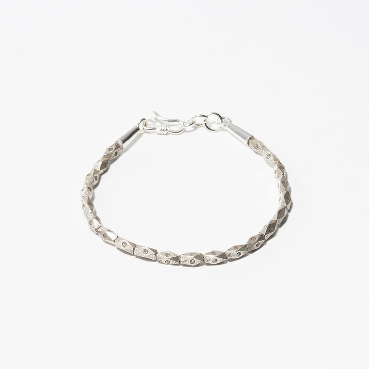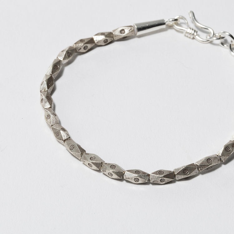 タイの山岳少数民族カレン族によるハンドメイドシルバービーズブレスレットの本作。熟練の職人による手作業で、ひとつひとつ丁寧に制作しています。独特の風合いを醸し出す、味わい深いシルバーの表情が特徴。シンプルなスタイリングに合わせれば、さり気ないお洒落が楽しめます。刻印で『パドゥア』というカレン族の幸せの象徴であるお花の模様が型押し。