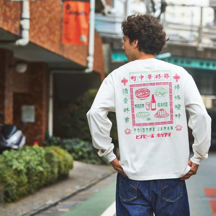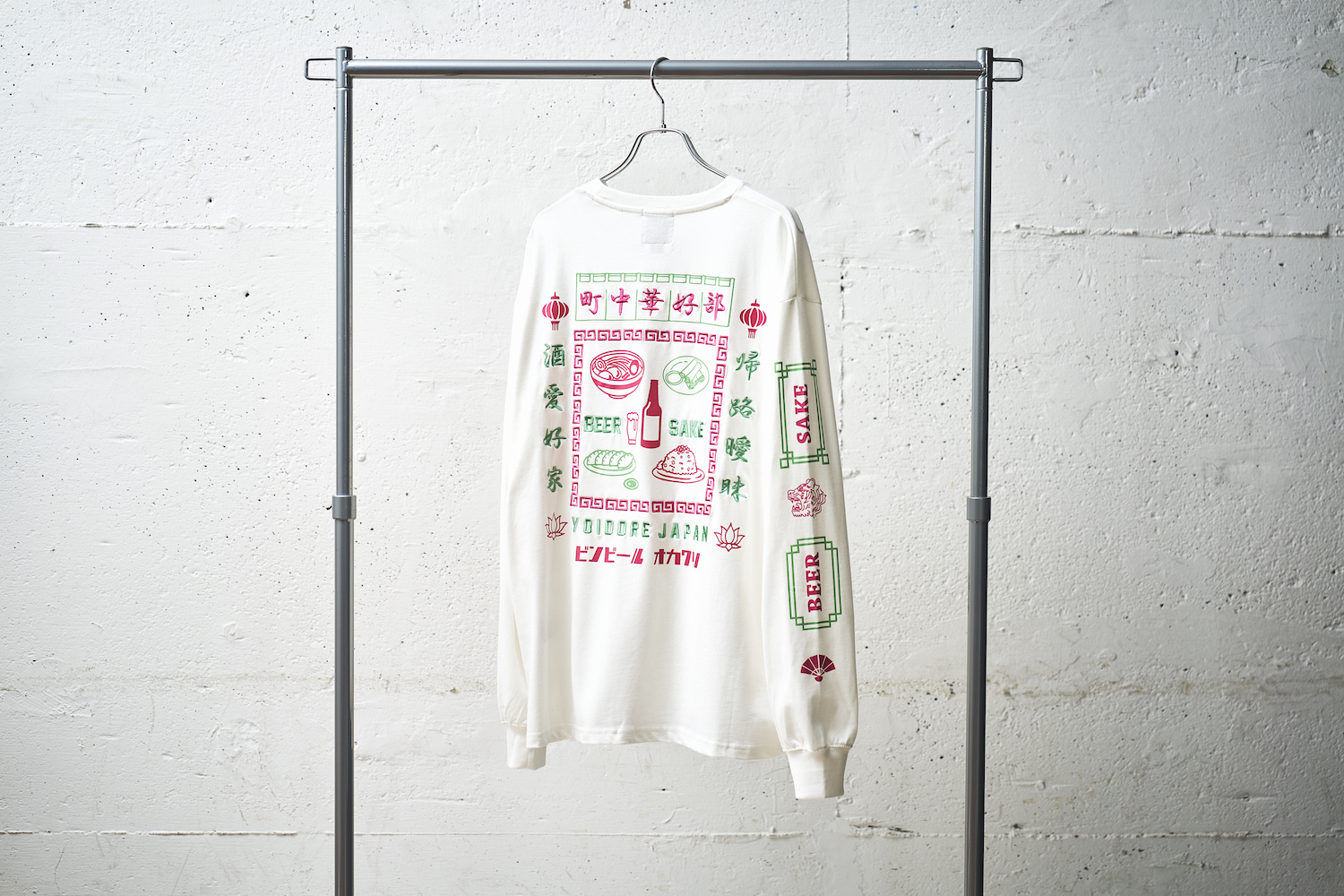 町中華が食べたくなる美味しい一枚は、乾杯好きのために生まれたブランド「YOIDORE」の真骨頂。ネタTでありながらネタTにあらずな着ているだけで楽しい一枚。否応無しに盛り上がる鉄板ロンTを着ていざ、町中華へ! 会話も盛り上がること間違いなし!
